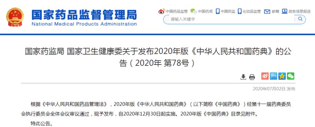 2020年版《中國藥典》正式頒布
