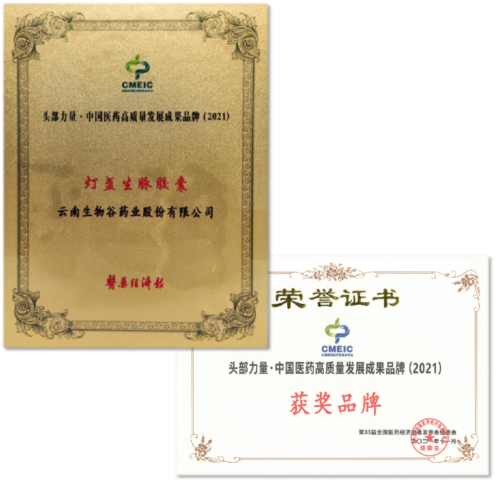 在本次高峰會議中,一并頒發了原定于2021年度11月份召開,因疫情原因延遲的第33屆(2021年度)全國醫藥經濟信息發布會的行業頭部力量重磅獎項,云南生物谷藥業獲得“頭部力量·中國醫藥高質量發展成果企業”榮譽,成為行業百強之一,公司產品燈盞生脈膠囊獲得“頭部力量·中國醫藥高質量發展品牌”榮譽。